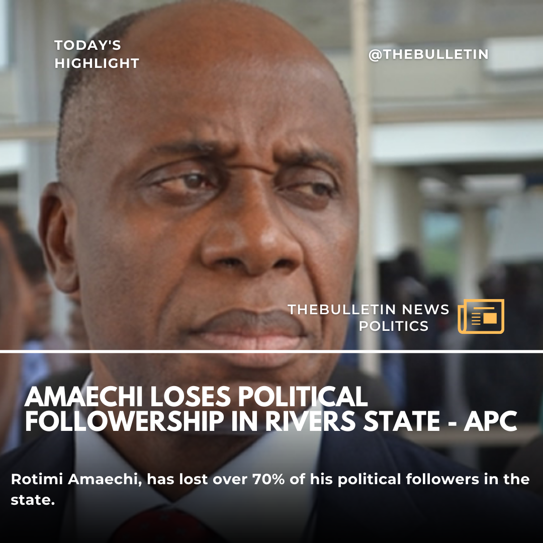 The All Progressives Congress (APC) in Rivers State has claimed that former Minister of Transportation, Rotimi Amaechi, has lost over 70% of his political followers in the state. The Secretary of the State APC Caretaker Committee, Eric Nwibani, made this assertion during a news briefing in Port Harcourt.