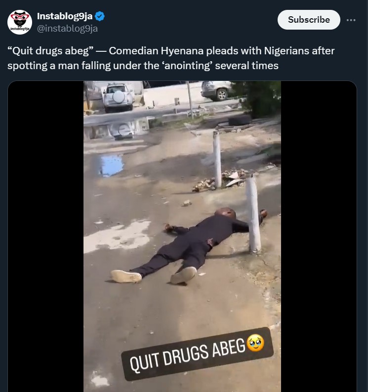 Popular Nigerian comedian, Hyenana, is making a heartfelt plea to Nigerians to quit drugs after witnessing a disturbing incident. During a recent performance, he spotted a man repeatedly falling under the influence of an unknown substance, simulating a state of being “under the anointing.”