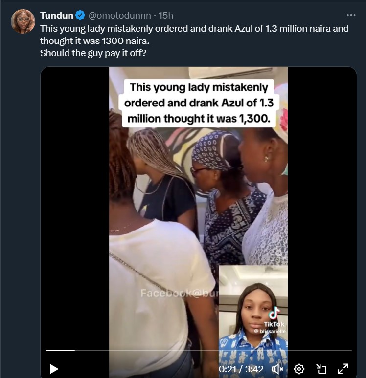 It all began when the young lady, whose name remains undisclosed, visited a high-end bar and decided to indulge in what she thought was an ordinary drink. Unknown to her, the drink she ordered, known as Azul, carried an exorbitant price tag of 1.3 million naira. In her defense, the menu or the staff failed to adequately communicate the drink’s extraordinary cost, leading to this unfortunate mix-up.