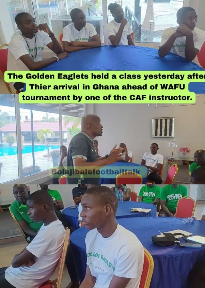 In preparation for the highly anticipated WAFU tournament, the Golden Eaglets, Nigeria’s national under-17 football team, recently participated in a crucial training/lecture session upon their arrival in Ghana. The session, led by Dr. Mohammed Ameenu, a respected instructor from the Confederation of African Football (CAF) and a member of the Nigeria Football Federation (NFF), focused on educating the players and officials about the laws of the game.