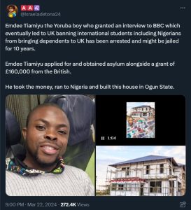 According to reports, Tiamiyu successfully obtained refugee status in the UK and was granted a substantial £160,000 government grant. However, instead of abiding by the requirement to remain in the country, he allegedly returned to Nigeria and even flaunted a new home on social media.