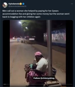 According to threads on the social media platform, an unnamed Good Samaritan had generously covered the individual’s accommodation costs for two years and provided additional funds. However, images recently posted showed the woman once again begging with her children, ostensibly seeking more handouts.